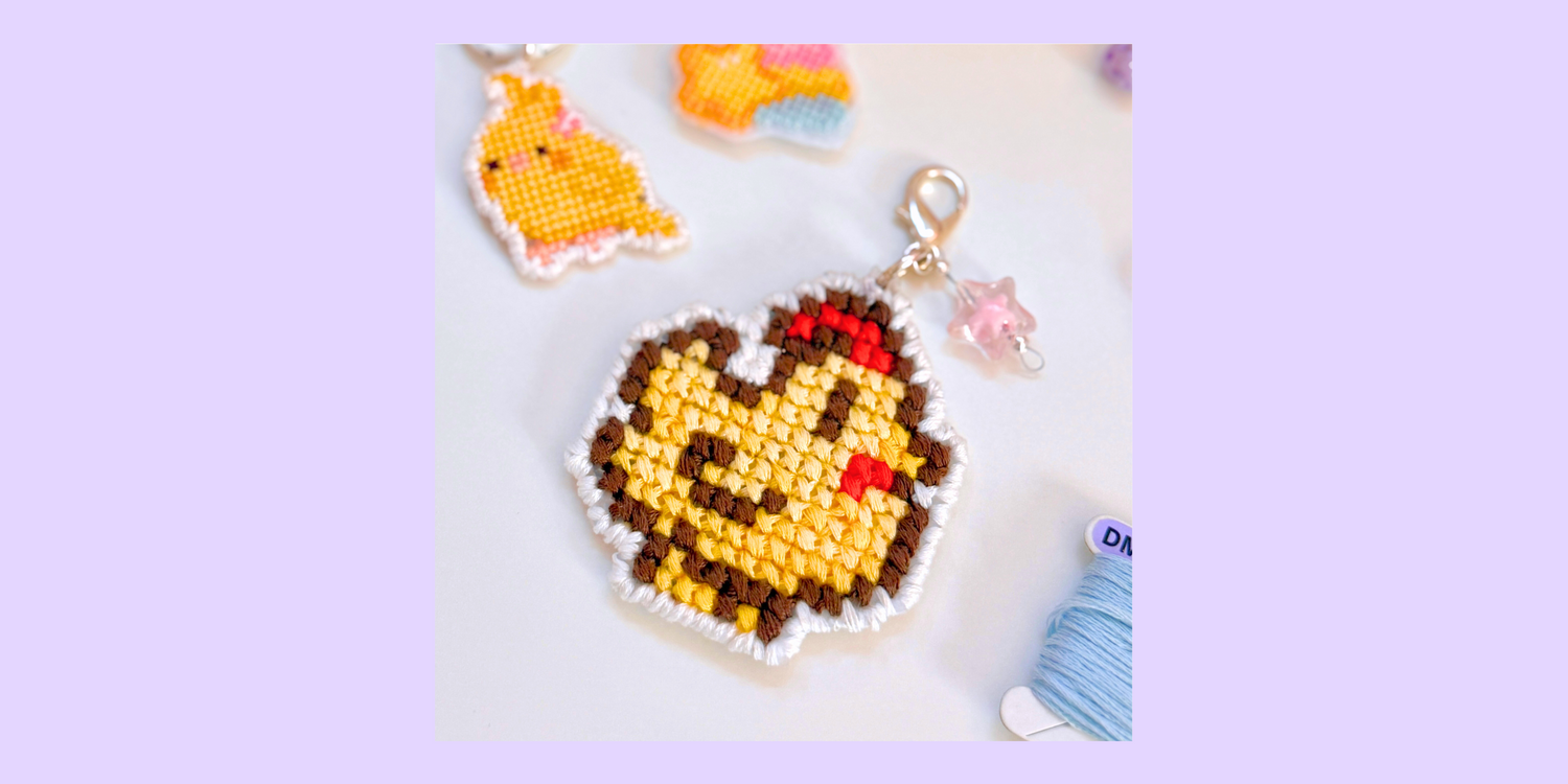 You will receive a zip file containing the pattern and a keychain tutorial guide. The finished design is 15 x 16 stitches and uses 5 floss colors.