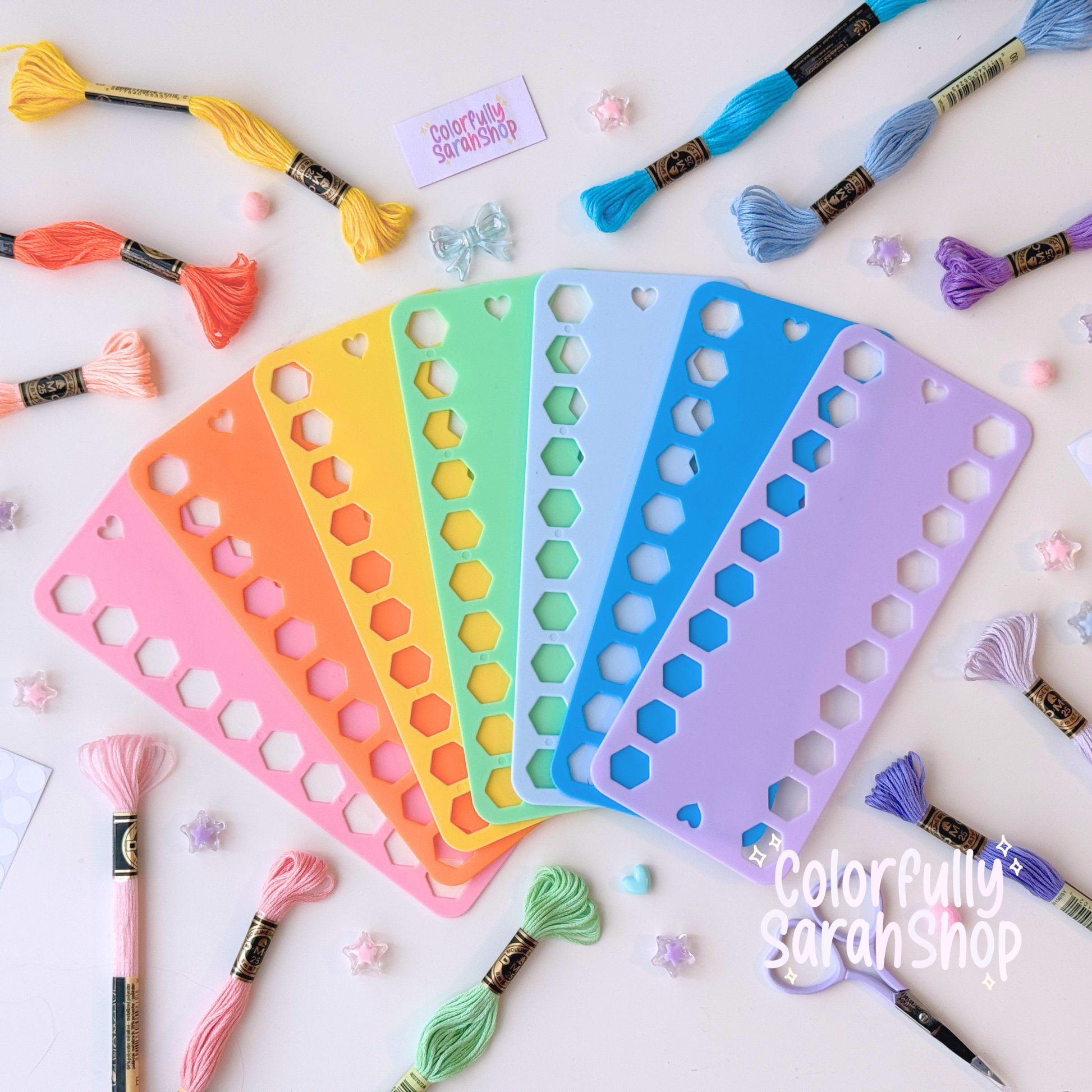 A simple way to store and organize all of your floss for a small project! Fits up to 20 different floss colors and includes a set of blank labels. Comes in 7 color options.